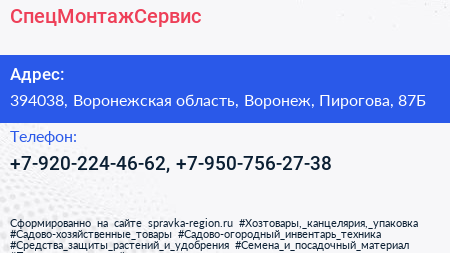 СпецМонтажСервис по адресу 394038, Воронежская область, Воронеж, Пирогова, 87Б в дальнейшем Организация, размещена в следующих категориях: