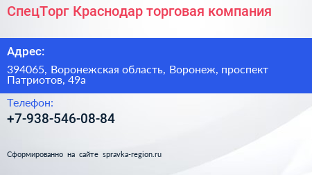 СпецТорг-Краснодар, торговая компания по адресу 394065, Воронежская область, Воронеж, проспект Патриотов, 49а в дальнейшем Организация, размещена в следующих категориях: