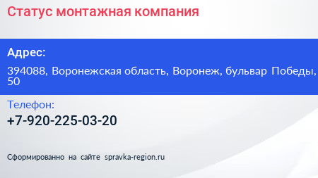 Статус, монтажная компания по адресу 394088, Воронежская область, Воронеж, бульвар Победы, 50 в дальнейшем Организация, размещена в следующих категориях: