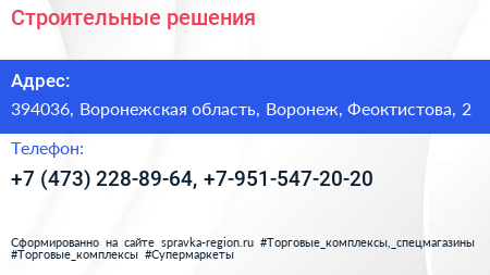 Строительные решения по адресу 394036, Воронежская область, Воронеж, Феоктистова, 2 в дальнейшем Организация, размещена в следующих категориях:
