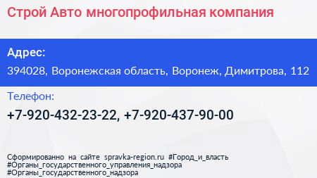 Строй-Авто, многопрофильная компания по адресу 394028, Воронежская область, Воронеж, Димитрова, 112 в дальнейшем Организация, размещена в следующих категориях:
