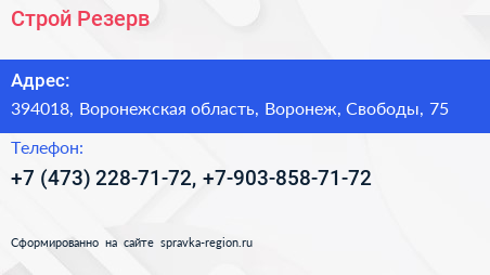 Строй Резерв по адресу 394018, Воронежская область, Воронеж, Свободы, 75 в дальнейшем Организация, размещена в следующих категориях: