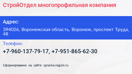 СтройОтдел, многопрофильная компания по адресу 394026, Воронежская область, Воронеж, проспект Труда, 48 в дальнейшем Организация, размещена в следующих категориях: