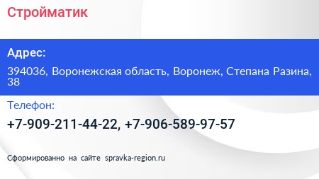 Стройматик по адресу 394036, Воронежская область, Воронеж, Степана Разина, 38 в дальнейшем Организация, размещена в следующих категориях: