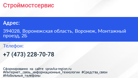 Строймостсервис по адресу 394028, Воронежская область, Воронеж, Монтажный проезд, 2Б в дальнейшем Организация, размещена в следующих категориях: