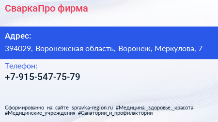 СваркаПро, фирма по адресу 394029, Воронежская область, Воронеж, Меркулова, 7 в дальнейшем Организация, размещена в следующих категориях: