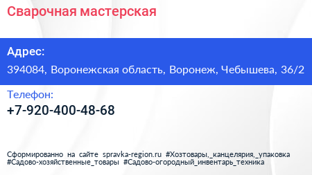 Сварочная мастерская по адресу 394084, Воронежская область, Воронеж, Чебышева, 36/2 в дальнейшем Организация, размещена в следующих категориях: