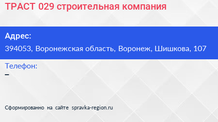 ТРАСТ 029, строительная компания по адресу 394053, Воронежская область, Воронеж, Шишкова, 107 в дальнейшем Организация, размещена в следующих категориях: