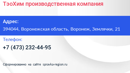 ТэоХим, производственная компания по адресу 394044, Воронежская область, Воронеж, Землячки, 21 в дальнейшем Организация, размещена в следующих категориях: