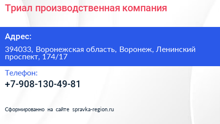 Триал, производственная компания по адресу 394033, Воронежская область, Воронеж, Ленинский проспект, 174/17 в дальнейшем Организация, размещена в следующих категориях: