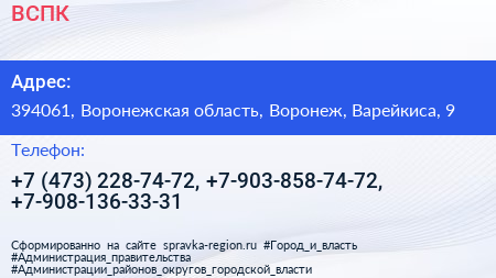 ВСПК по адресу 394061, Воронежская область, Воронеж, Варейкиса, 9 в дальнейшем Организация, размещена в следующих категориях: