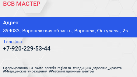 ВСВ МАСТЕР по адресу 394033, Воронежская область, Воронеж, Остужева, 25 в дальнейшем Организация, размещена в следующих категориях:
