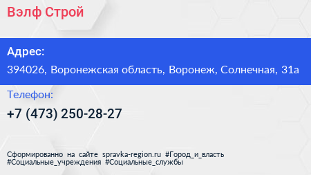 Вэлф-Строй по адресу 394026, Воронежская область, Воронеж, Солнечная, 31а в дальнейшем Организация, размещена в следующих категориях: