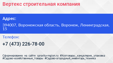 Вертекс, строительная компания по адресу 394007, Воронежская область, Воронеж, Ленинградская, 15 в дальнейшем Организация, размещена в следующих категориях: