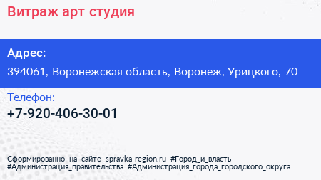 Витраж, арт-студия по адресу 394061, Воронежская область, Воронеж, Урицкого, 70 в дальнейшем Организация, размещена в следующих категориях: