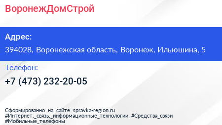 ВоронежДомСтрой по адресу 394028, Воронежская область, Воронеж, Ильюшина, 5 в дальнейшем Организация, размещена в следующих категориях: