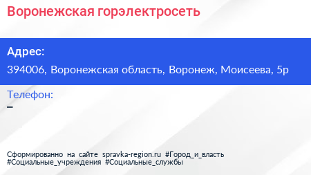 Воронежская горэлектросеть по адресу 394006, Воронежская область, Воронеж, Моисеева, 5р в дальнейшем Организация, размещена в следующих категориях: