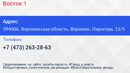 Восток-1 по адресу 394006, Воронежская область, Воронеж, Пирогова, 15/5 в дальнейшем Организация, размещена в следующих категориях: