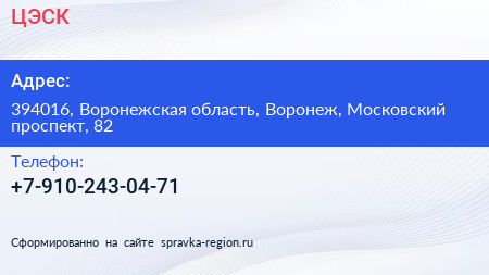 ЦЭСК по адресу 394016, Воронежская область, Воронеж, Московский проспект, 82 в дальнейшем Организация, размещена в следующих категориях: