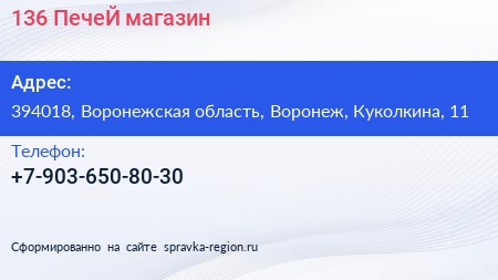 136 ПечеЙ, магазин по адресу 394018, Воронежская область, Воронеж, Куколкина, 11 в дальнейшем Организация, размещена в следующих категориях:
