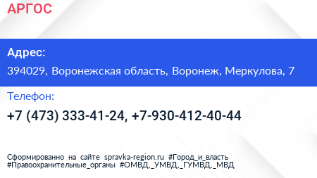 АРГОС по адресу 394029, Воронежская область, Воронеж, Меркулова, 7 в дальнейшем Организация, размещена в следующих категориях: