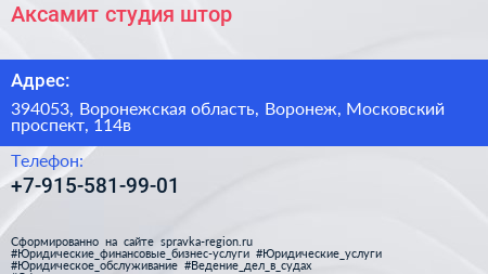 Аксамит, студия штор по адресу 394053, Воронежская область, Воронеж, Московский проспект, 114в в дальнейшем Организация, размещена в следующих категориях: