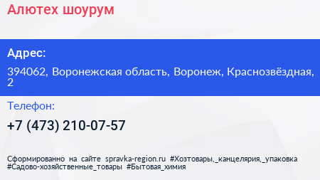 Алютех, шоурум по адресу 394062, Воронежская область, Воронеж, Краснозвёздная, 2 в дальнейшем Организация, размещена в следующих категориях:
