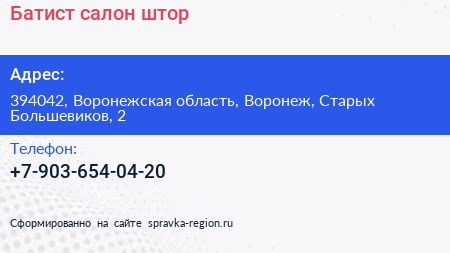 Батист, салон штор по адресу 394042, Воронежская область, Воронеж, Старых Большевиков, 2 в дальнейшем Организация, размещена в следующих категориях: