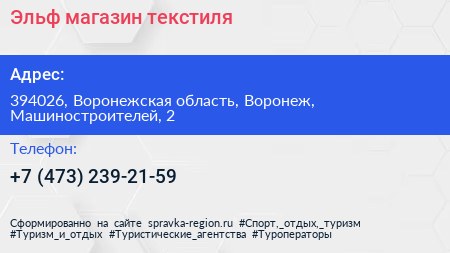 Эльф, магазин текстиля по адресу 394026, Воронежская область, Воронеж, Машиностроителей, 2 в дальнейшем Организация, размещена в следующих категориях: