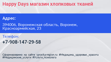 Happy Days, магазин хлопковых тканей по адресу 394006, Воронежская область, Воронеж, Красноармейская, 23 в дальнейшем Организация, размещена в следующих категориях:
