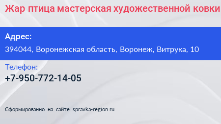 Жар птица, мастерская художественной ковки по адресу 394044, Воронежская область, Воронеж, Витрука, 10 в дальнейшем Организация, размещена в следующих категориях: