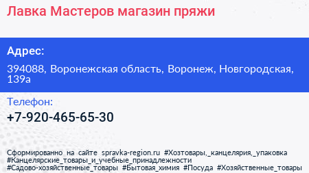 Лавка Мастеров, магазин пряжи по адресу 394088, Воронежская область, Воронеж, Новгородская, 139а в дальнейшем Организация, размещена в следующих категориях: