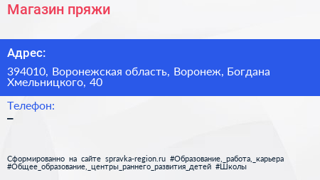 Магазин пряжи по адресу 394010, Воронежская область, Воронеж, Богдана Хмельницкого, 40 в дальнейшем Организация, размещена в следующих категориях: