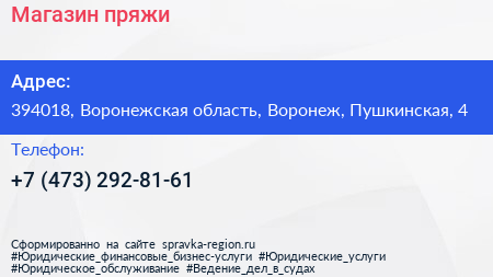 Магазин пряжи по адресу 394018, Воронежская область, Воронеж, Пушкинская, 4 в дальнейшем Организация, размещена в следующих категориях: