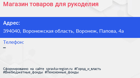 Магазин товаров для рукоделия по адресу 394040, Воронежская область, Воронеж, Папова, 4а в дальнейшем Организация, размещена в следующих категориях: