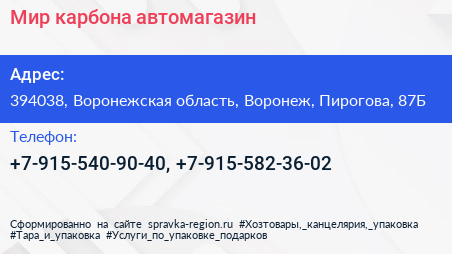 Мир карбона, автомагазин по адресу 394038, Воронежская область, Воронеж, Пирогова, 87Б в дальнейшем Организация, размещена в следующих категориях: