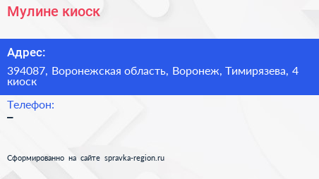 Мулине, киоск по адресу 394087, Воронежская область, Воронеж, Тимирязева, 4 киоск в дальнейшем Организация, размещена в следующих категориях: