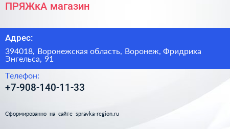 ПРЯЖкА, магазин по адресу 394018, Воронежская область, Воронеж, Фридриха Энгельса, 91 в дальнейшем Организация, размещена в следующих категориях: