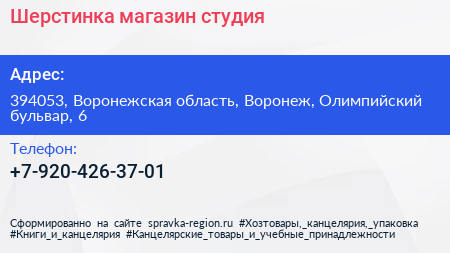 Шерстинка, магазин-студия по адресу 394053, Воронежская область, Воронеж, Олимпийский бульвар, 6 в дальнейшем Организация, размещена в следующих категориях: