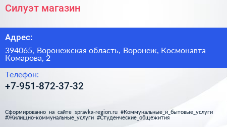 Силуэт, магазин по адресу 394065, Воронежская область, Воронеж, Космонавта Комарова, 2 в дальнейшем Организация, размещена в следующих категориях: