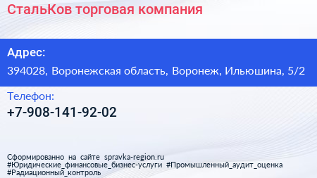 СтальКов, торговая компания по адресу 394028, Воронежская область, Воронеж, Ильюшина, 5/2 в дальнейшем Организация, размещена в следующих категориях: