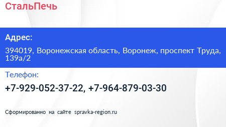 СтальПечь по адресу 394019, Воронежская область, Воронеж, проспект Труда, 139а/2 в дальнейшем Организация, размещена в следующих категориях: