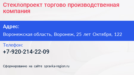 Стеклопроект, торгово-производственная компания по адресу Воронежская область, Воронеж, 25 лет Октября, 122 в дальнейшем Организация, размещена в следующих категориях:
