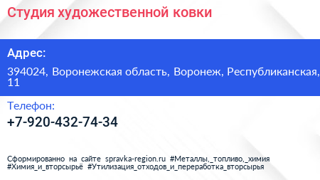 Студия художественной ковки по адресу 394024, Воронежская область, Воронеж, Республиканская, 11 в дальнейшем Организация, размещена в следующих категориях: