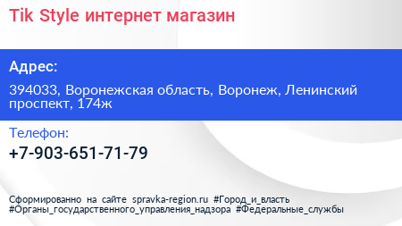 Tik-Style, интернет-магазин по адресу 394033, Воронежская область, Воронеж, Ленинский проспект, 174ж в дальнейшем Организация, размещена в следующих категориях:
