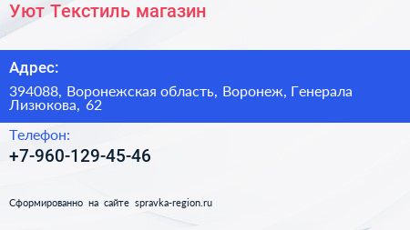 Уют Текстиль, магазин по адресу 394088, Воронежская область, Воронеж, Генерала Лизюкова, 62 в дальнейшем Организация, размещена в следующих категориях: