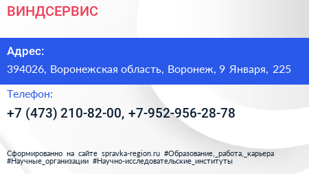 ВИНДСЕРВИС по адресу 394026, Воронежская область, Воронеж, 9 Января, 225 в дальнейшем Организация, размещена в следующих категориях: