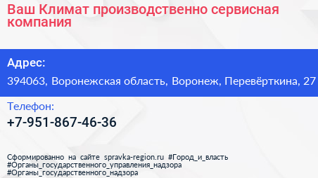 Ваш Климат, производственно-сервисная компания по адресу 394063, Воронежская область, Воронеж, Перевёрткина, 27 в дальнейшем Организация, размещена в следующих категориях: