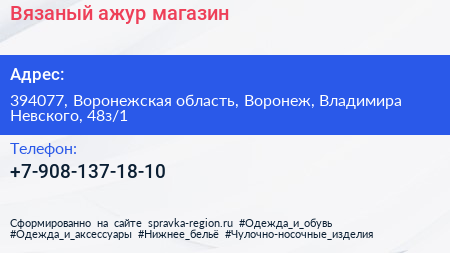 Вязаный ажур, магазин по адресу 394077, Воронежская область, Воронеж, Владимира Невского, 48з/1 в дальнейшем Организация, размещена в следующих категориях:
