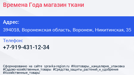 Времена Года, магазин ткани по адресу 394018, Воронежская область, Воронеж, Никитинская, 35 в дальнейшем Организация, размещена в следующих категориях: